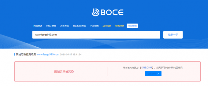 比如我們現(xiàn)在已知結(jié)尾含有919數(shù)字的域名會被劫持,任意一個******919.com查詢確實也是污染狀態(tài),我們就要避免注冊這類域名。