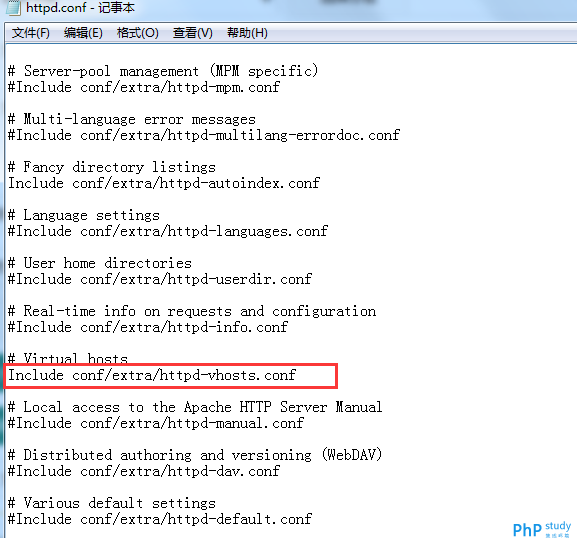 1.編輯httpd.conf文件,開(kāi)啟虛擬主機(jī),位置:在apache的安裝目錄,即phpstudy安裝目錄下的phpStudy\Apache\conf,找到Includeconf/extra/httpd-vhosts.conf,去掉前面的#