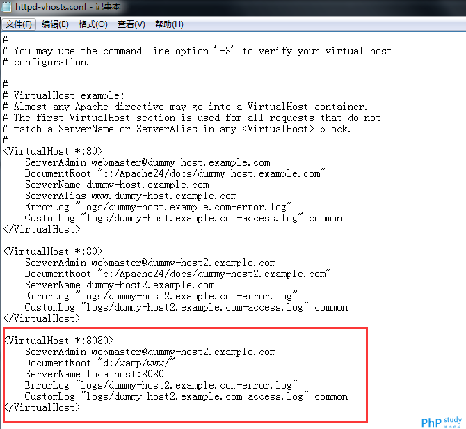 2. 進(jìn)入開(kāi)啟的虛擬主機(jī)文件httpd-vhosts.conf進(jìn)行域名配置,位置:\phpStudy\Apache\conf\extra目錄下