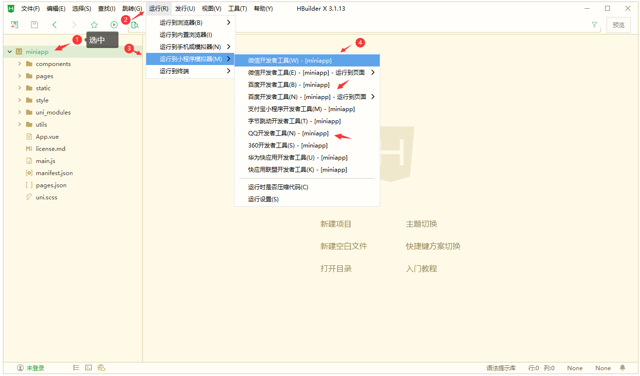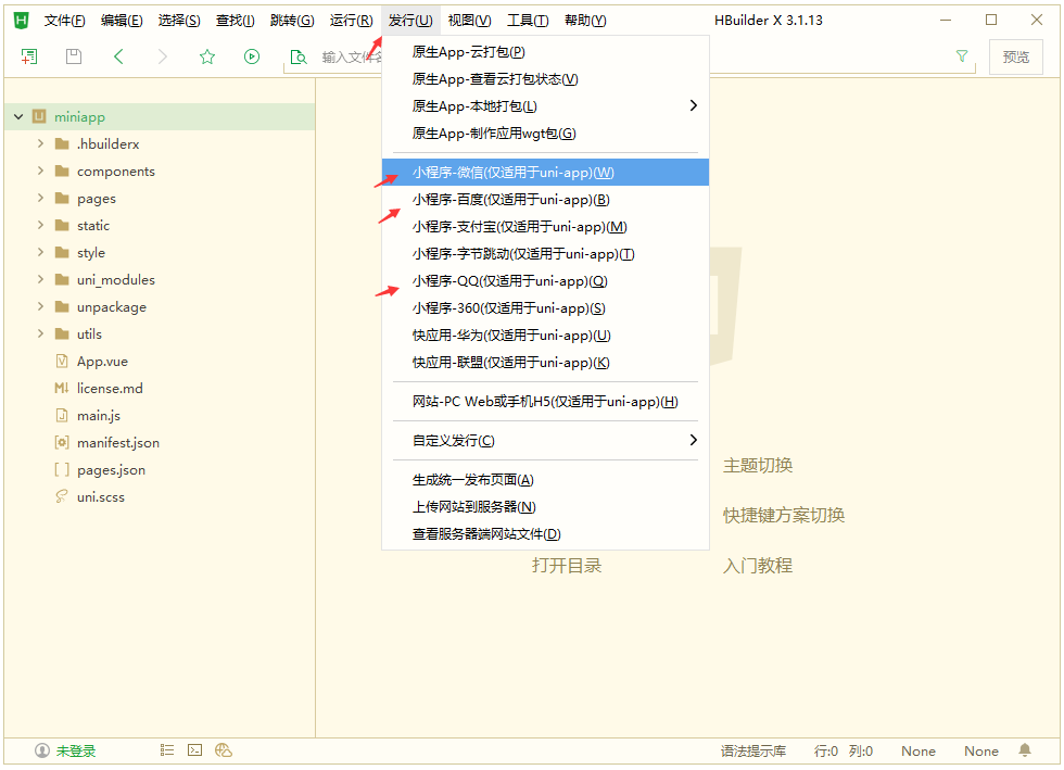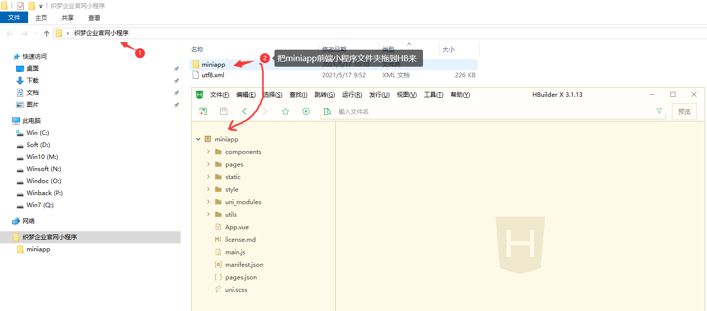 7、在 HBuilderX 軟件里導(dǎo)入 miniapp 小程序前端包文件夾