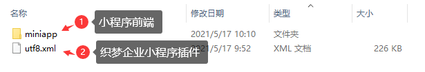 解壓后得到織夢企業(yè)官方網(wǎng)小程序插件和一個miniapp小程序前端包文件夾