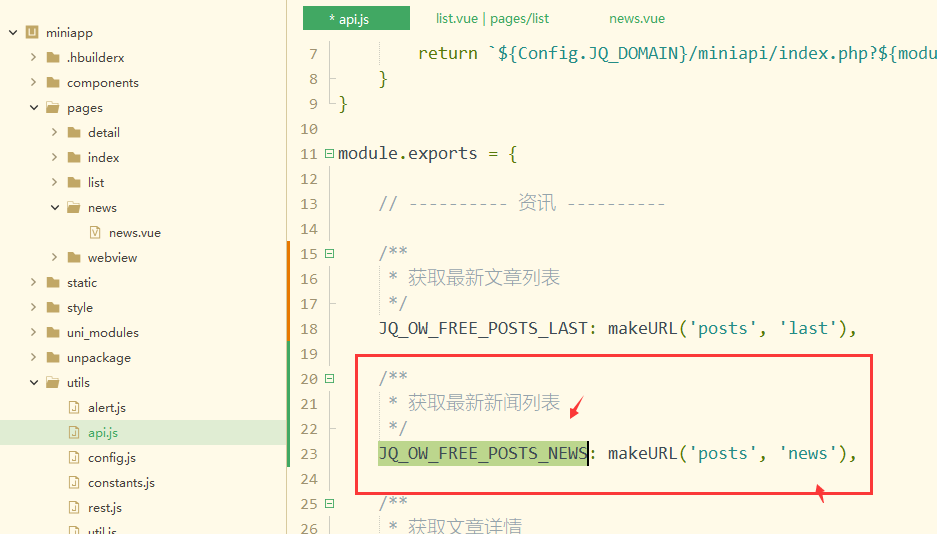 在api.js里添加新接口地址和變量與news.vue里的調(diào)用接口變量相同