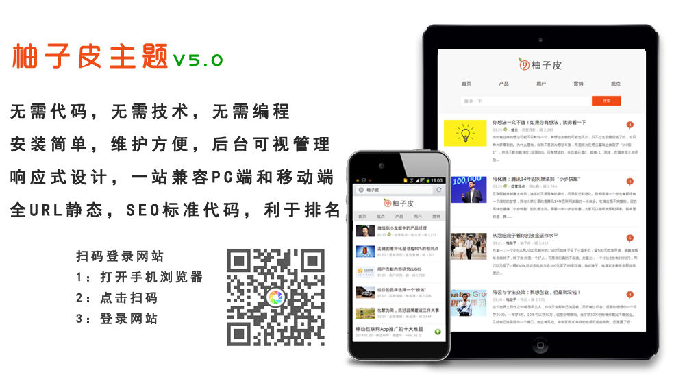 柚子皮主題是一款簡潔扁平風格主題,主題完全使用html5+css3組成的web框架。全新響應式設計觀念,支持多設備瀏覽。簡單可視后臺界面操作,讓不懂代碼的你更好駕馭。