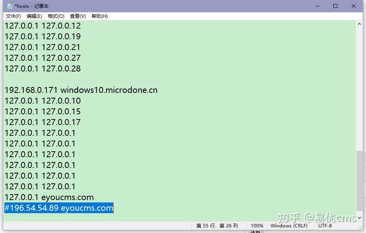 第二步:打開設(shè)置里面的hosts文件,添加一個(gè)#196.54.54.89 eyoucms.com,這個(gè)意思是不訪問196.54.54.89 這個(gè)iP的 http://eyoucms.com。