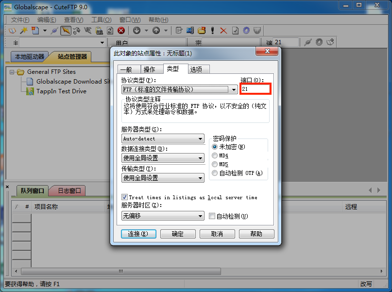 2. 在站點屬性頁面,單擊 類型 ,端口填寫為 21 。