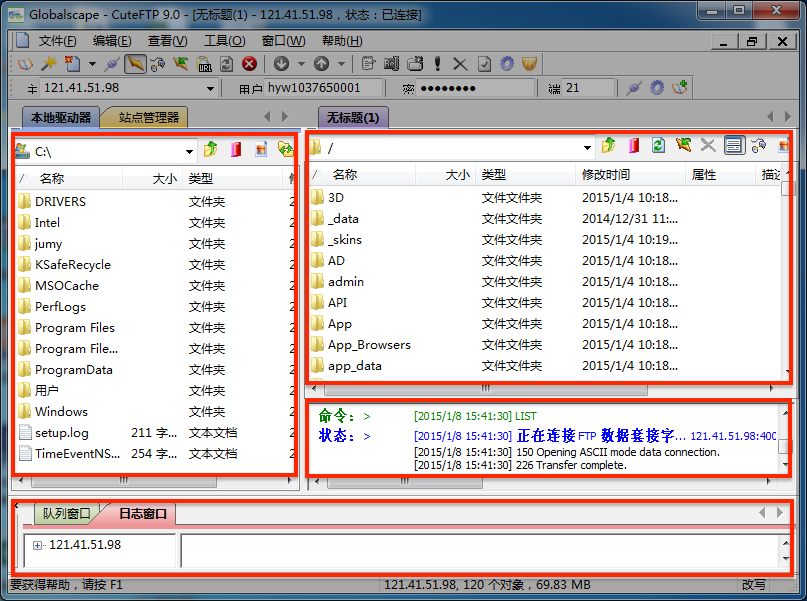 • 右邊:遠程區(qū)域即遠端服務器,雙擊目錄圖標可進入相關目錄;命令區(qū)域。