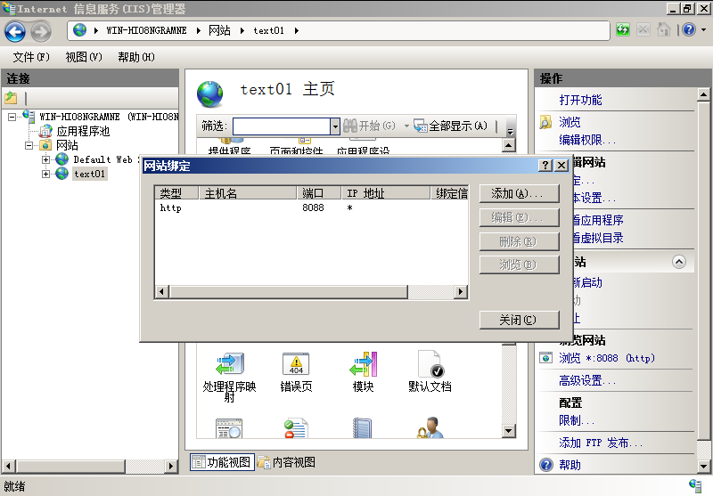 3、保存后返回,選擇右側(cè)邊綁定,然后選擇編輯 ,修改網(wǎng)站端口,80(默認(rèn))或其他端口,建議使用默認(rèn)80端口。也可以設(shè)置默認(rèn)站點(diǎn)IP地址。