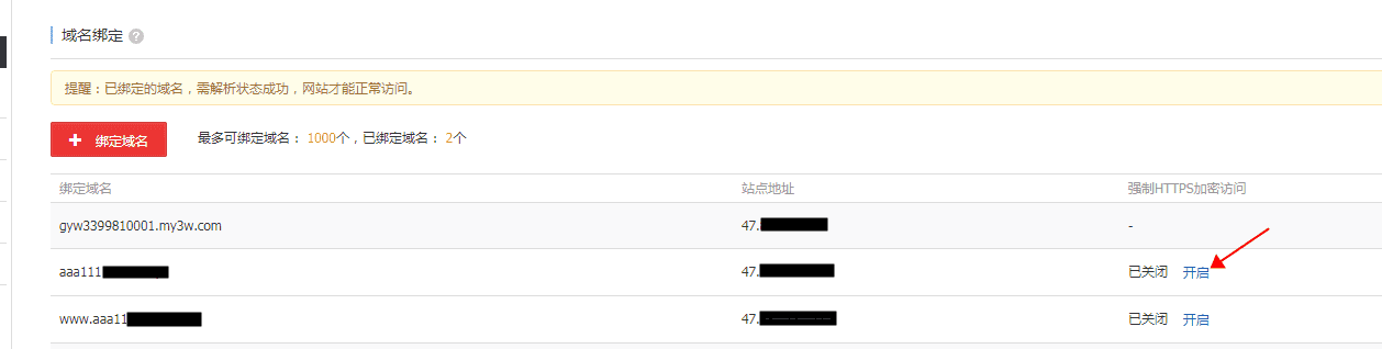 1.點(diǎn)擊綁定域名后面的“強(qiáng)制HTTPS加密訪問”下方對(duì)應(yīng)的“開啟”