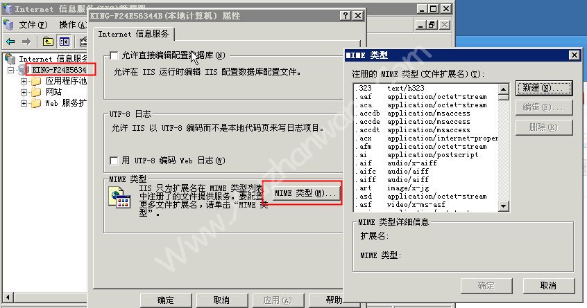 注:本文在win8環(huán)境下IIS7版本中填寫的MIME類型,在IIS6、IIS7 MIME類型管理所處位置不一樣,但是添加方式和參數(shù)均相同。