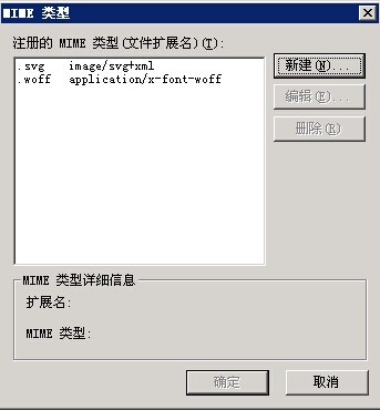 原因:因?yàn)榉⻊?wù)器IIS不認(rèn)SVG,WOFF/WOFF2 這幾個文件類型,只要在IIS上添加MIME 類型即可。