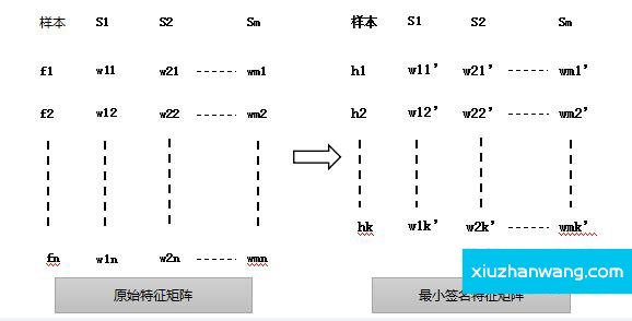 Minhash算法采用最小哈希函數(shù)族(一組隨機的最小哈希函數(shù))來構(gòu)建文檔的最小哈希簽名。文檔的最小哈希簽名矩陣是對原始特征矩陣降維的結(jié)果。應(yīng)用過程中,可以使用k個最小函數(shù)分別計算出集合的哈希最小值。設(shè)hi表示第i個最小hash函數(shù),最小簽名矩陣中列向量為樣本si的最小簽名向量,其中wij表示第j個最小hash函數(shù)對樣本i的最小哈希值。