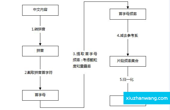 指紋生成的過程主要包括將文本全部轉(zhuǎn)換成拼音、截取每個字拼音的首字母、統(tǒng)計該粒度內(nèi)字母的頻率分布、通過和參考系比較,將結(jié)果進行歸一化、按字母序,將數(shù)字表征轉(zhuǎn)換成數(shù)字。
