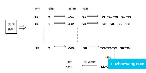 simhash算法通過計算每個特征(關(guān)鍵詞)的哈希值,并最終合并成一個特征值即指紋。