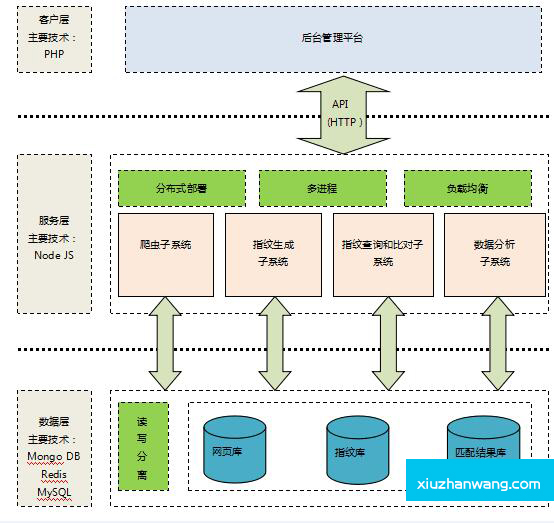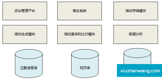 達觀指紋追蹤系統(tǒng)主要由爬蟲系統(tǒng)、指紋生成系統(tǒng)、指紋存儲、指紋查詢和比對、數(shù)據(jù)分析、后臺管理系統(tǒng)等幾個主要模塊構(gòu)成,如圖4所示。其中存儲層包括匹配結(jié)果信息庫、網(wǎng)頁庫以及指紋庫。