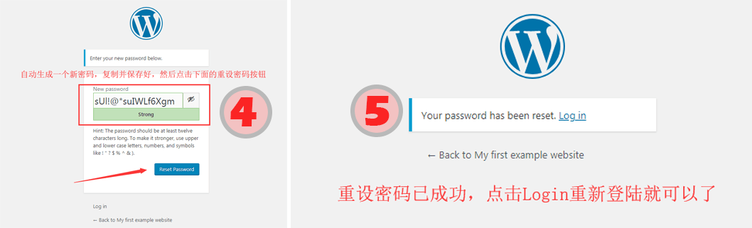 2、WordPress會自動生成一個新的密碼,復制并保存好,最后點擊重設(shè)密碼,密碼就重置好了,返回到登錄頁面就可以重新登錄了。