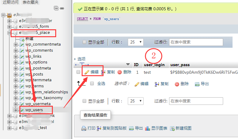 打開phpMyAdmin后,選擇對應網(wǎng)站的數(shù)據(jù)庫。找到 “wp_users” 數(shù)據(jù)表, 單擊然后編輯.數(shù)據(jù)庫