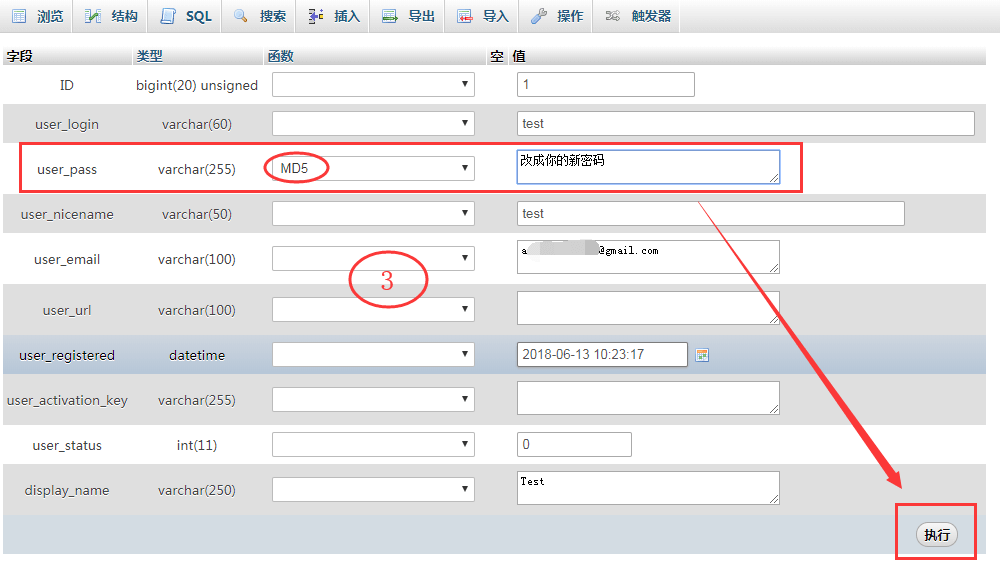 在”user_pass”一欄,下拉函數(shù)菜單選項,選擇MD5,刪除原來字段中的值,替換為你的新密碼,最后單擊執(zhí)行。注意保存好你的新密碼,因為點擊執(zhí)行后不再顯示你的密碼,而是一串加密的字符。WordPress 2.5版本以后采用了新的加密算法,會自動把MD5加密方式替換為新的加密算法進行加密。編輯數(shù)據(jù)表。