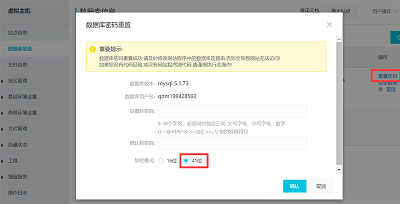 阿里云面板默認數(shù)據(jù)庫加密模式是16位,需要改成41位