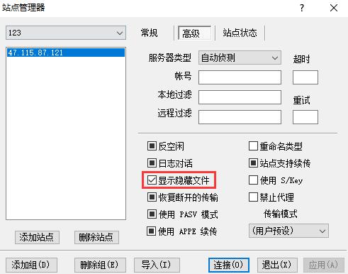 apache規(guī)則:默認.htaccess在FTP里是隱藏文件,需要在FTP里勾選顯示隱藏文件,如果在根目錄下未發(fā)現(xiàn)此文件則需要再次上傳(原始安裝包根目錄下有)